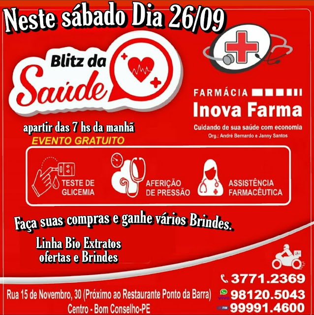 INOVA FARMA FARÁ BLITZ DA SAÚDE NESTE SÁBADO, 26/09